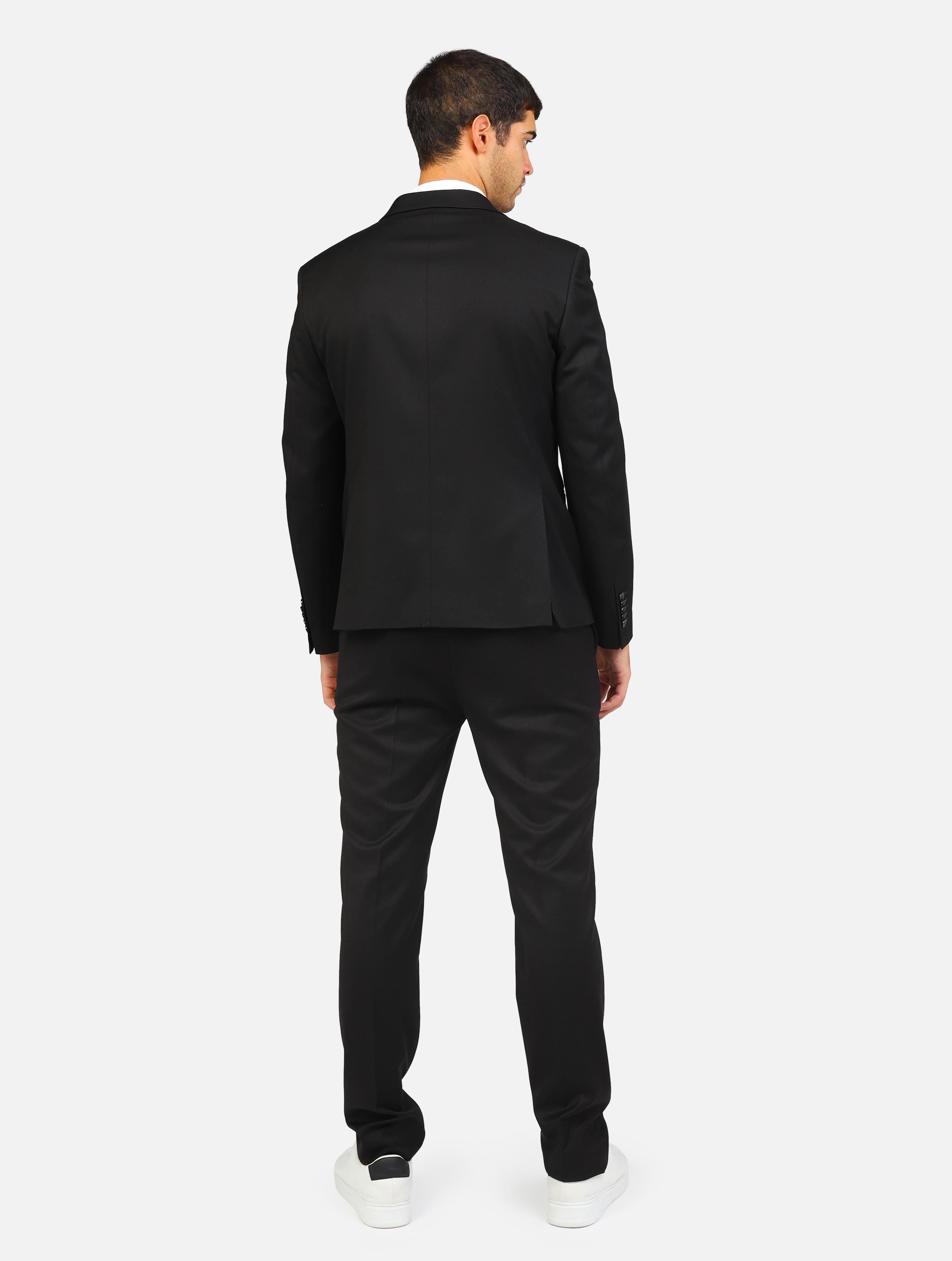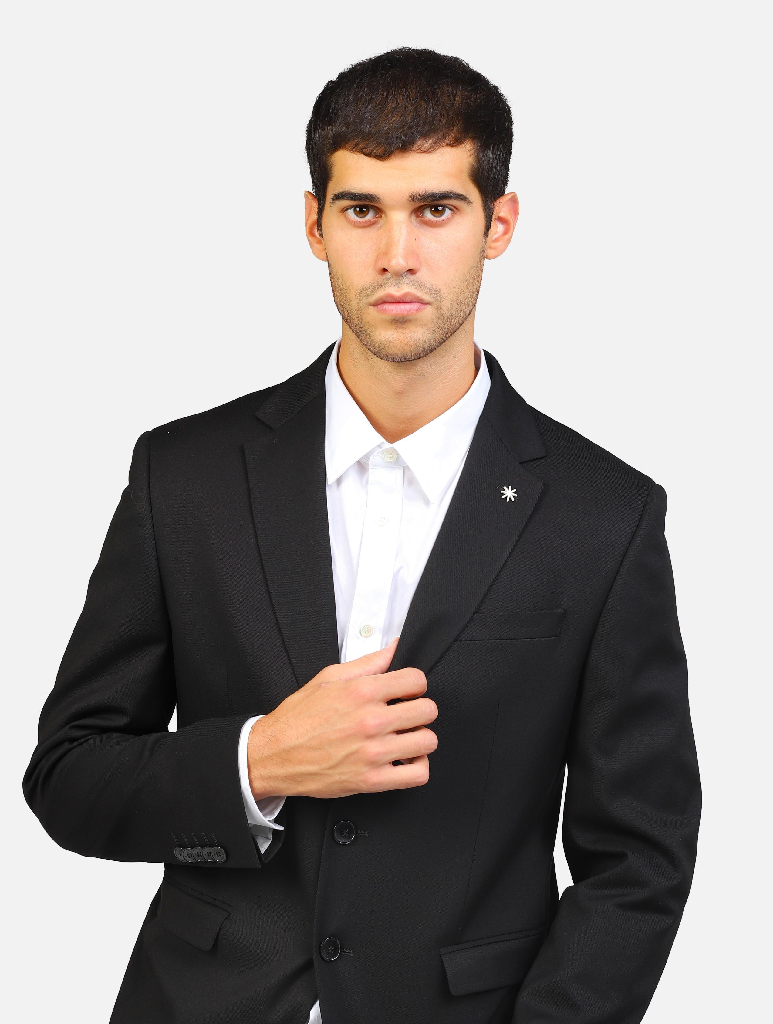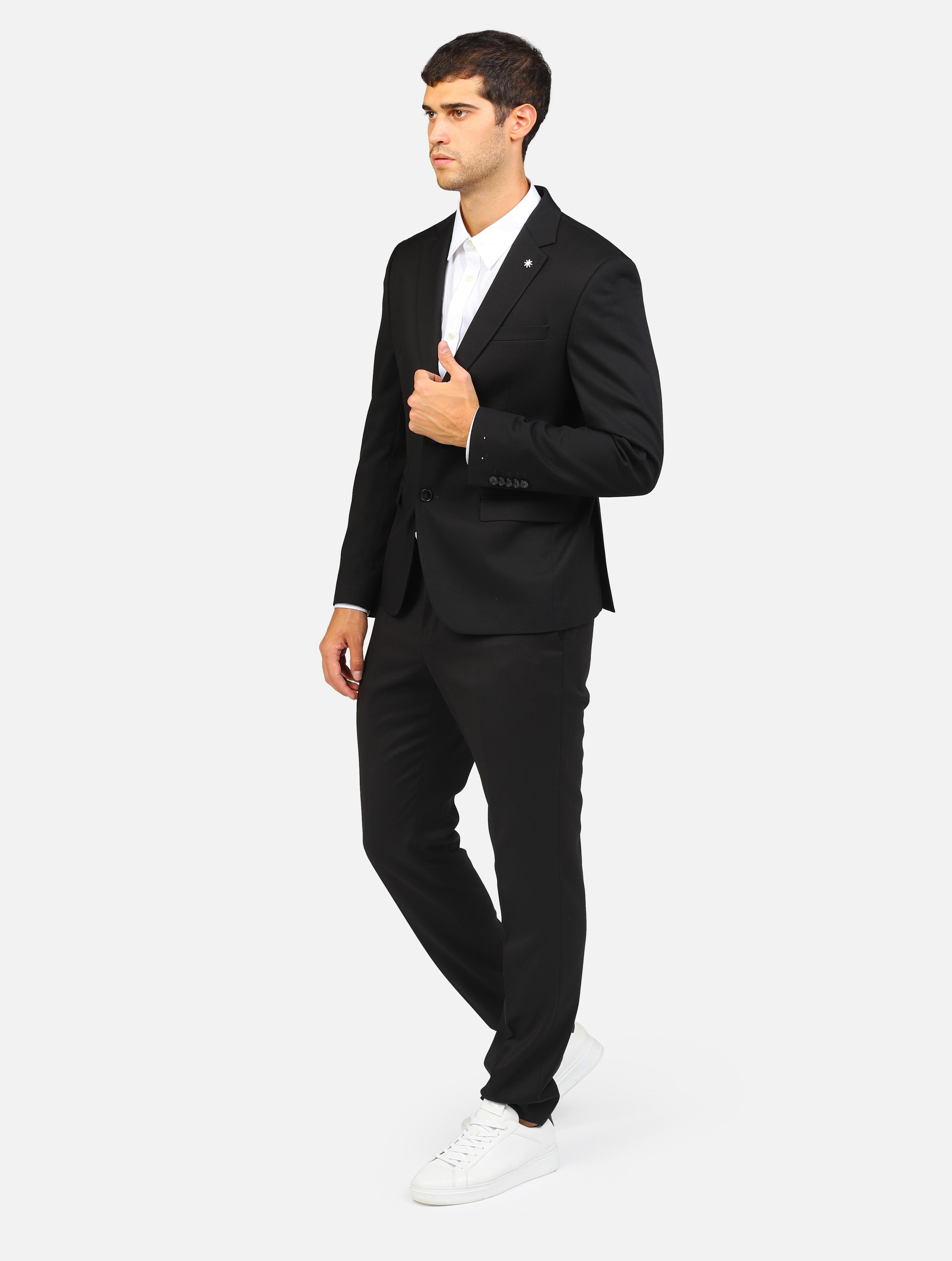 Abito da uomo composto da giacca e pantalone. La giacca presenta una chiusura monopetto con bottoni logati, taschino sul petto e tasche con patta sul davanti. Spalline imbottite, bottoni sul fondo della manica. Pantaloni a sigaretta, vita media con passanti. Chiusura con zip nascosta e bottone. Tasche sul davanti, tasche a filetto con bottone sul retro.
