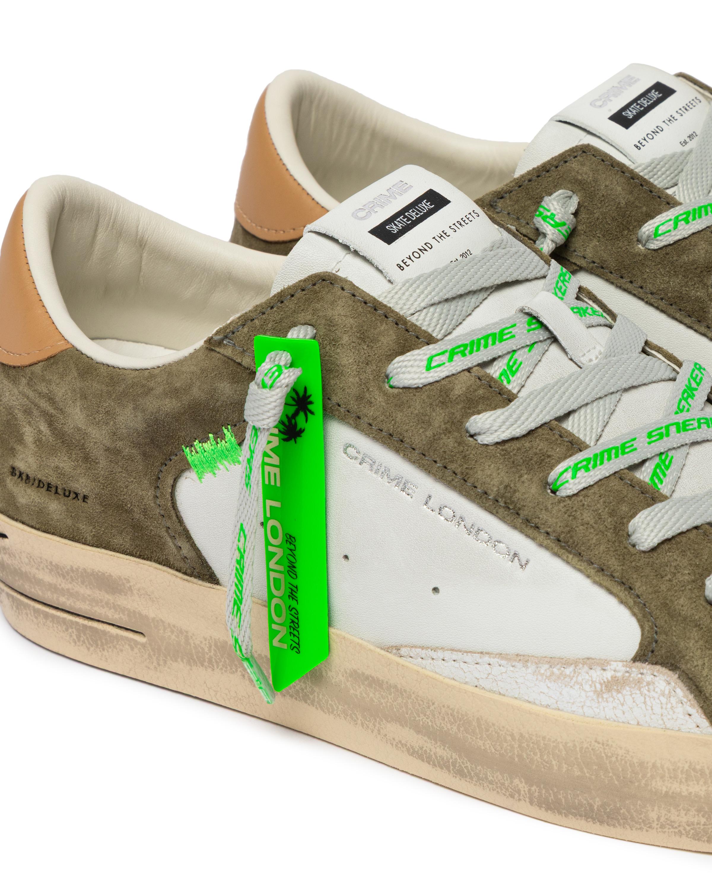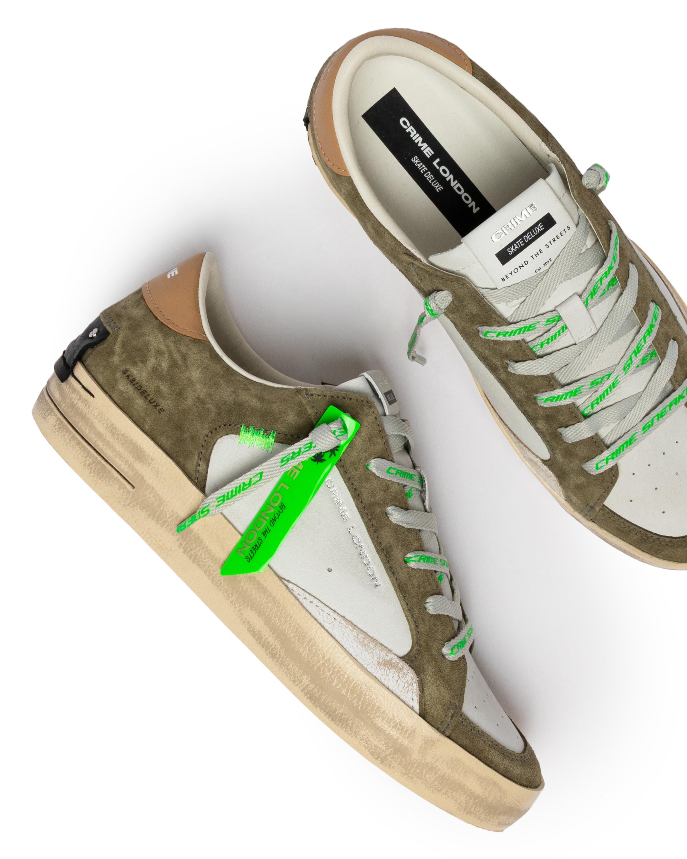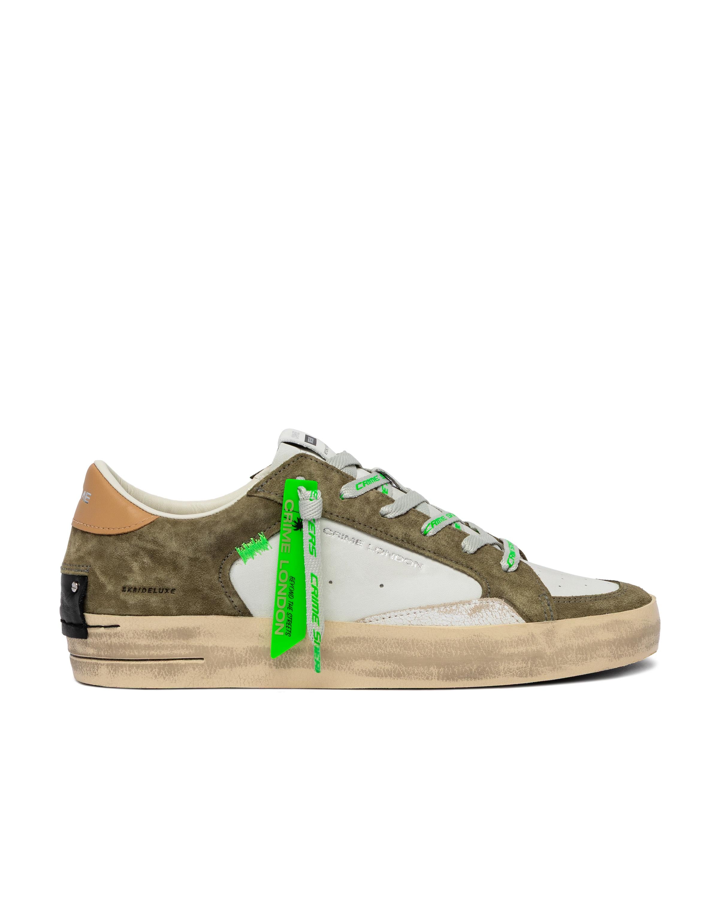 Sneaker realizzata con materiali di alta qualità Made in ItalyTomaia in pelle e suede bianco e verde militare, dettagli in suede biancoTalloncino in pelle nocciolaLinguetta in pelle bianca con label logata in pellePatch in pelle nera sul retroDoppio laccio grigio e marshmallowUnico tag lucido verde fluoFodera in pelle e tessutoSuola in ecopelle fasciata beige, alta 2.5 - 3 cm, fondo neroEffetto vintageVestibilità regular