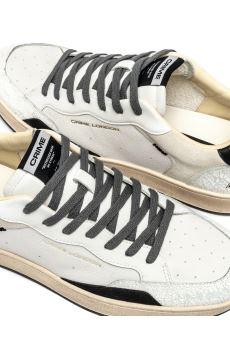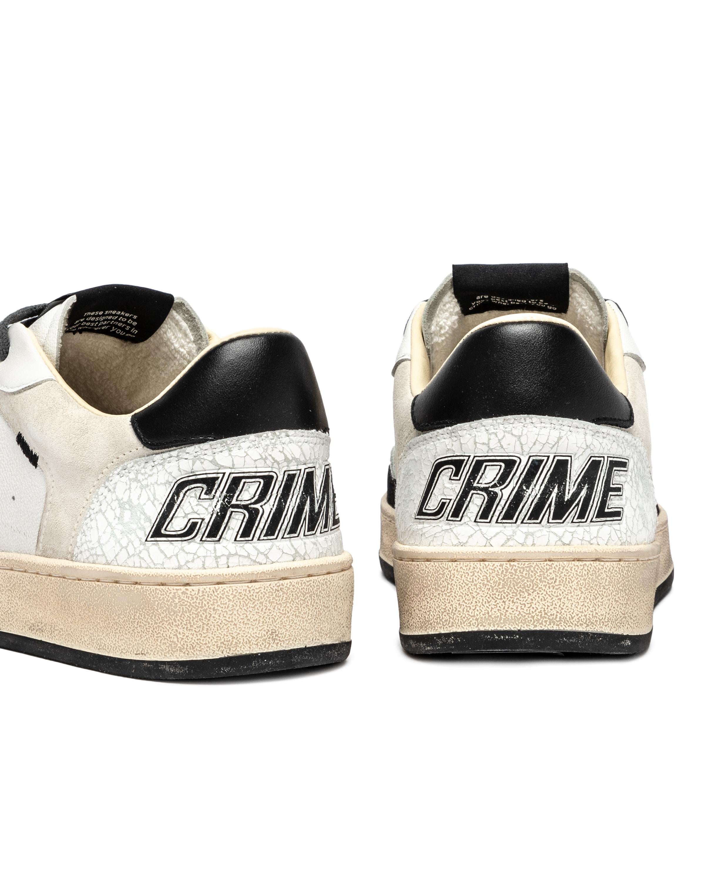 Sneaker realizzata con materiali di alta qualità Made in ItalyTomaia in pelle bianca, dettagli in suede neroTalloncino in pelle neroTallone in cracklé bianco con logo CRIMELinguetta in pelle bianca con label logata in tessutoDoppio laccio grigio scuro e neroFodera in pelle e tessutoSuola in gomma crema, alta 2.5 - 3.5 cm, fondo neroEffetto vintageVestibilità regular
