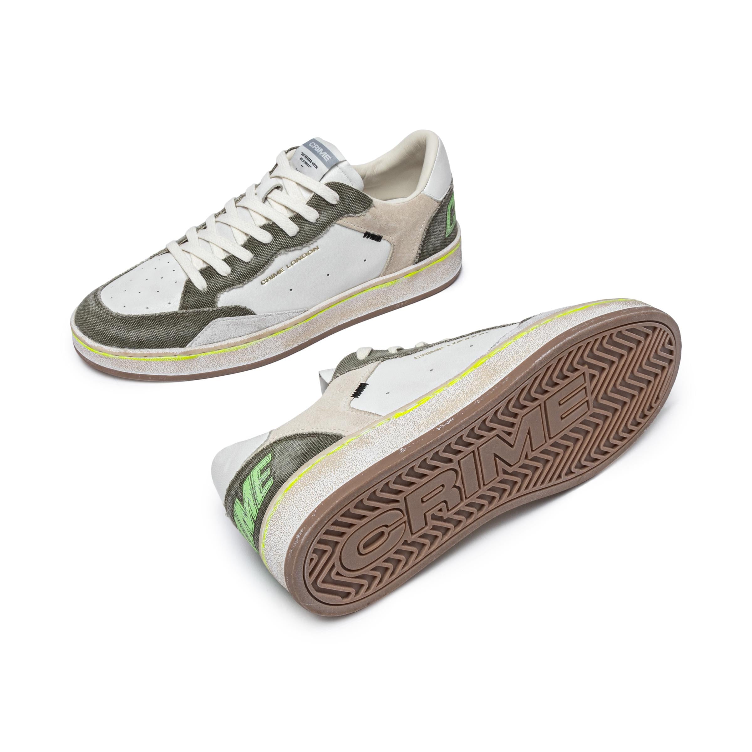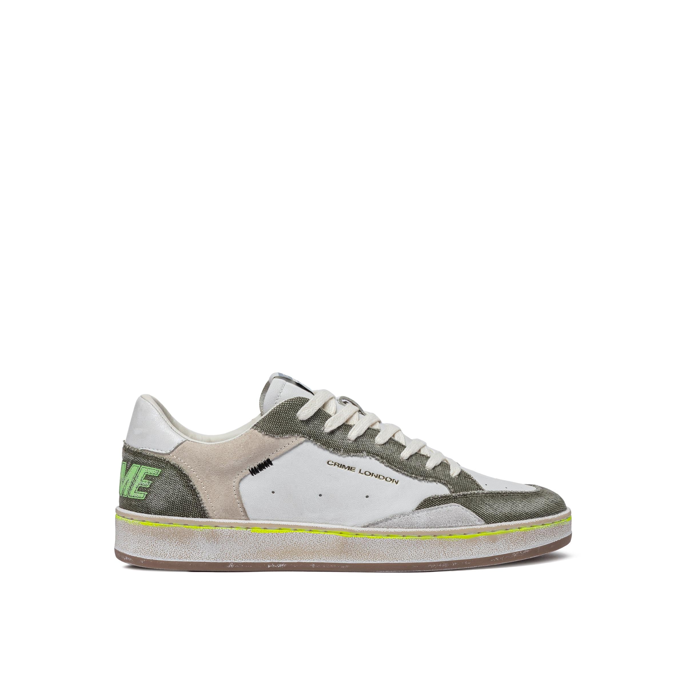 Sneaker realizzata con materiali di alta qualità Made in ItalyTomaia in pelle bianca, dettagli in suede grigio chiaroTalloncino in pelle biancaTallone in tessuto verde militare con logo CRIMELinguetta in pelle bianca con label logata in tessutoLacci bianchi in cotoneFodera in pelle e tessutoSuola in gomma beige, alta 2.5 - 3.5 cm, fondo taupeEffetto vintageVestibilità regular