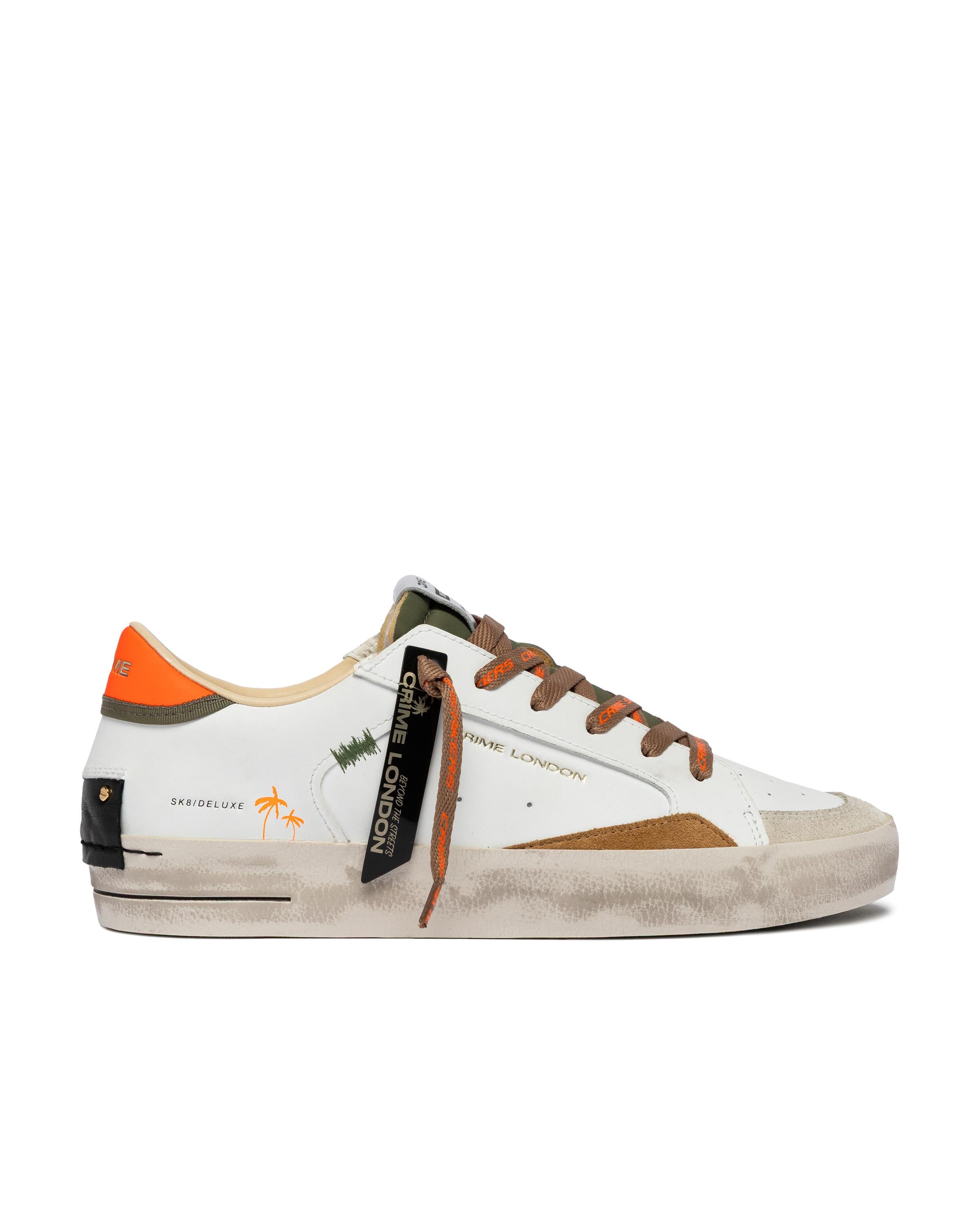 Sneaker realizzata con materiali di alta qualità Made in ItalyTomaia in pelle bianca, dettagli in suede ambraTalloncino in pelle arancio fluoLinguetta in tessuto kaki con label logata in pellePatch in pelle nera sul retroDoppio laccio marrone e grigioUnico tag lucido neroFodera in pelle e tessutoSuola in ecopelle fasciata panna, alta 2.5 - 3 cm, fondo verde militareEffetto vintageVestibilità regular