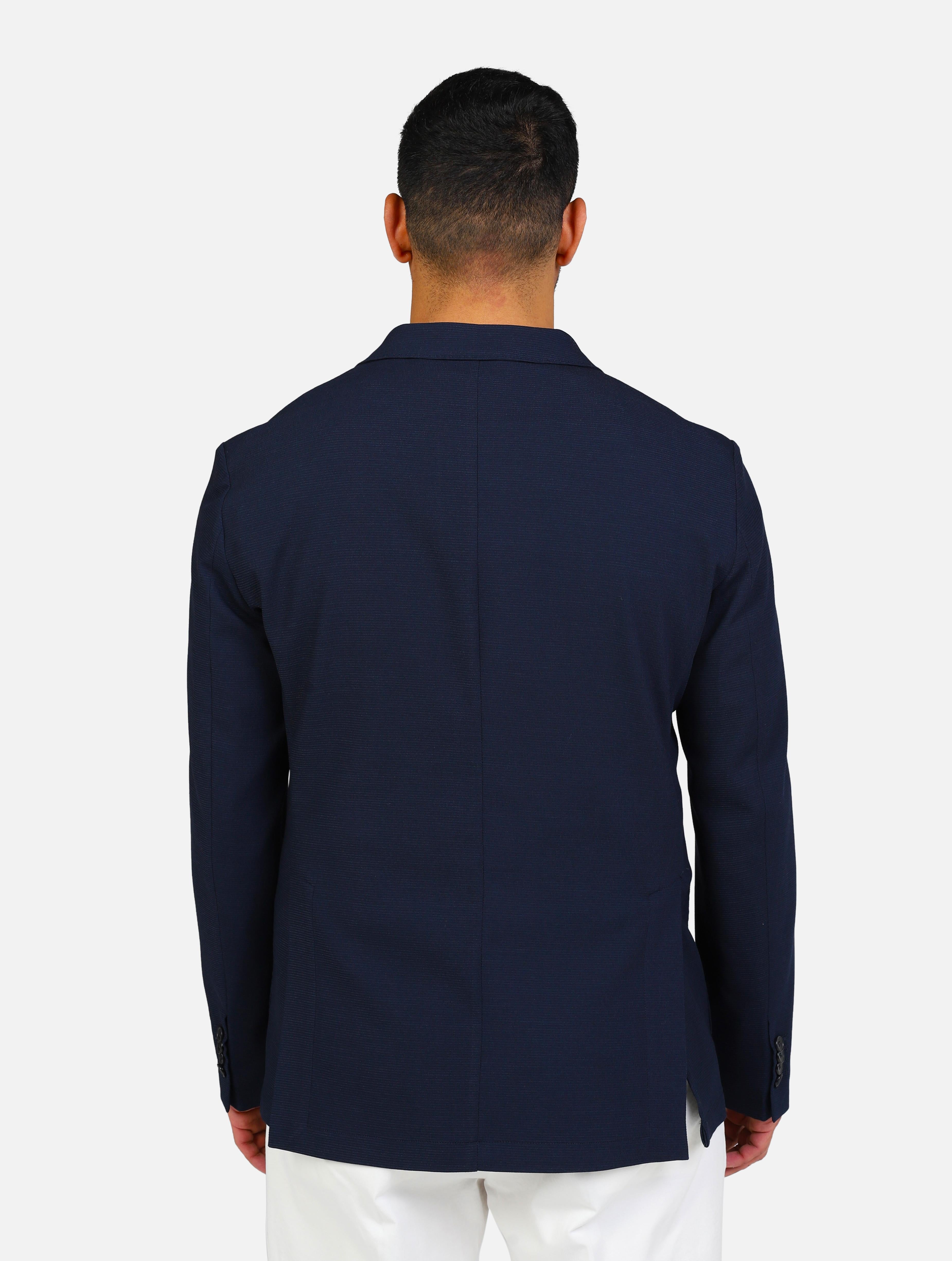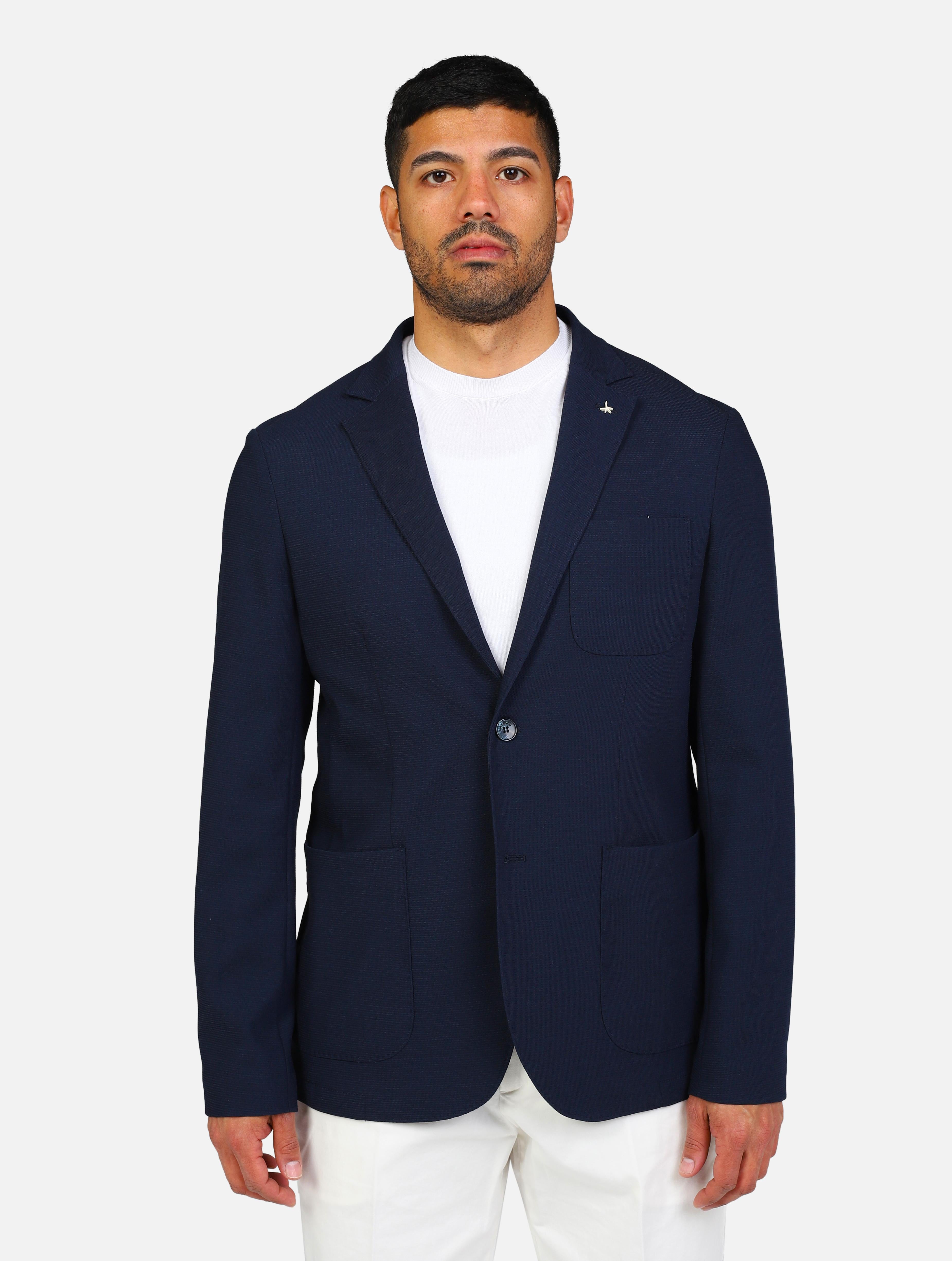Art a302gege78jr019: giacca a due bottoni in jersey con taschino a toppa sul petto, maniche con polsini abbottonati, collo a revers, fondo spacchi blu navy uomo