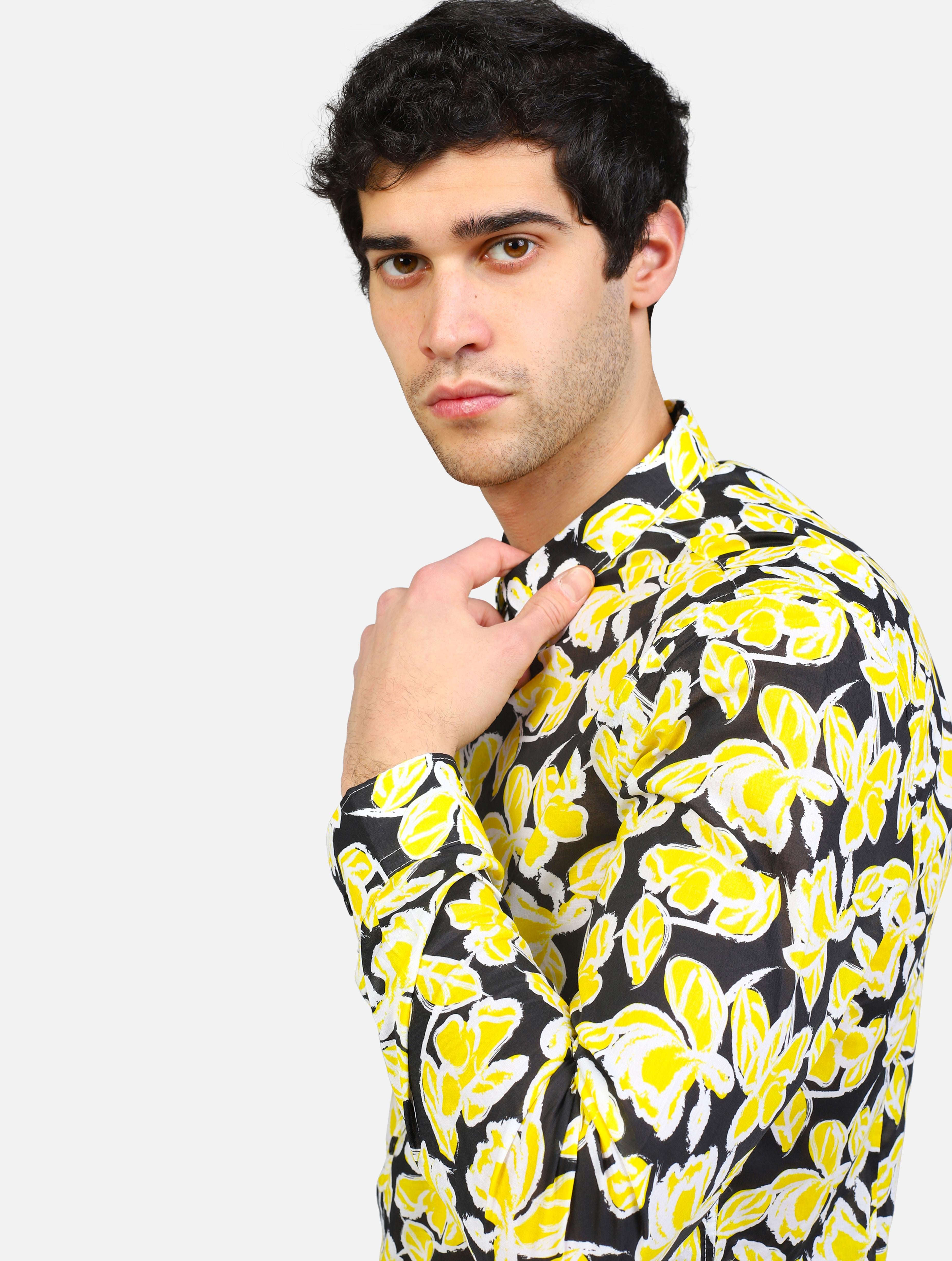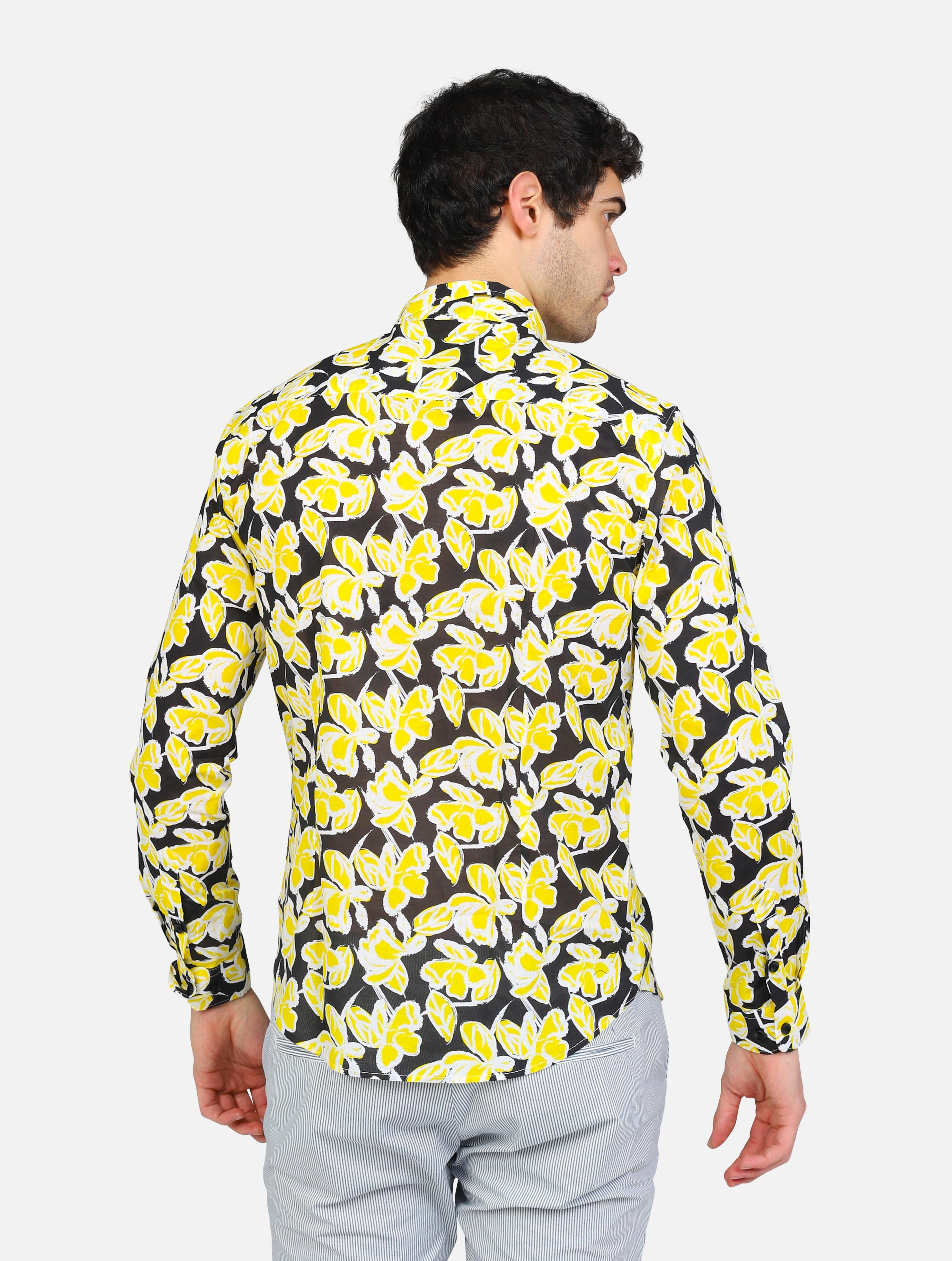 Art gl120da: camicia collo piccolo con fantasia floreale nero-giallo uomo