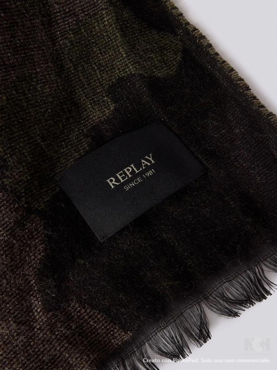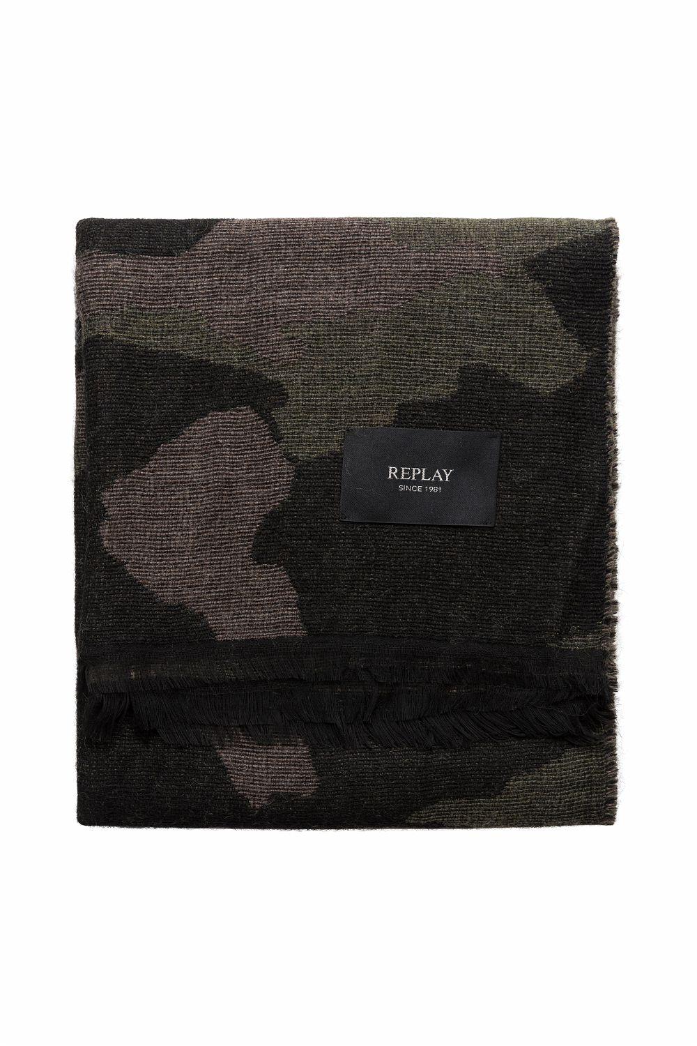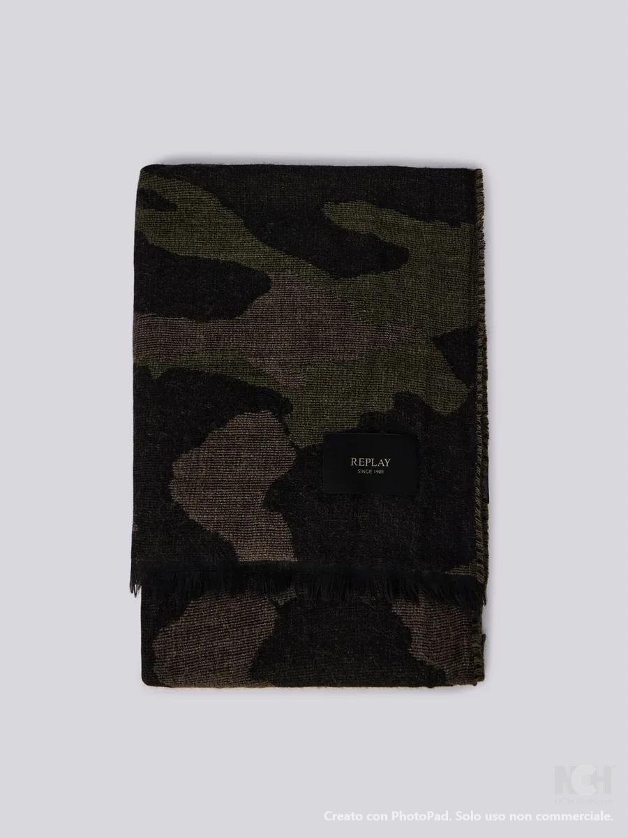 Sciarpa realizzata in misto lana con fantasia camouflage all over. Il modello è rifinito con piccole frange e un'etichetta logata applicata al fondo.